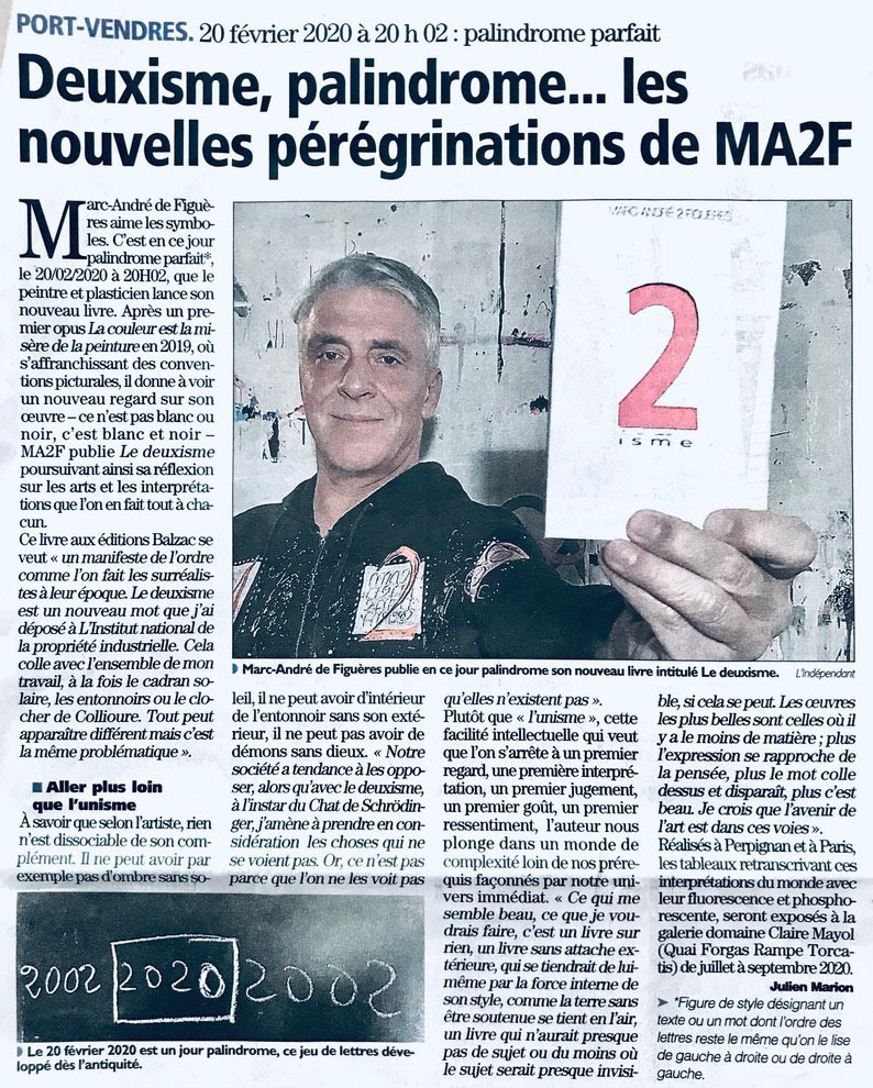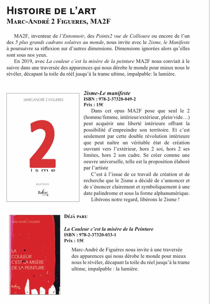Le 2centrisme est ainsi l’origine, la boussole et la respiration du 2isme. Il en est le noyau brûlant, l’invention qui place Marc-André 2 Figuères non seulement comme artiste, mais comme cartographe d’un centre nouveau, d’où l’univers peut enfin être vu dans sa totalité.